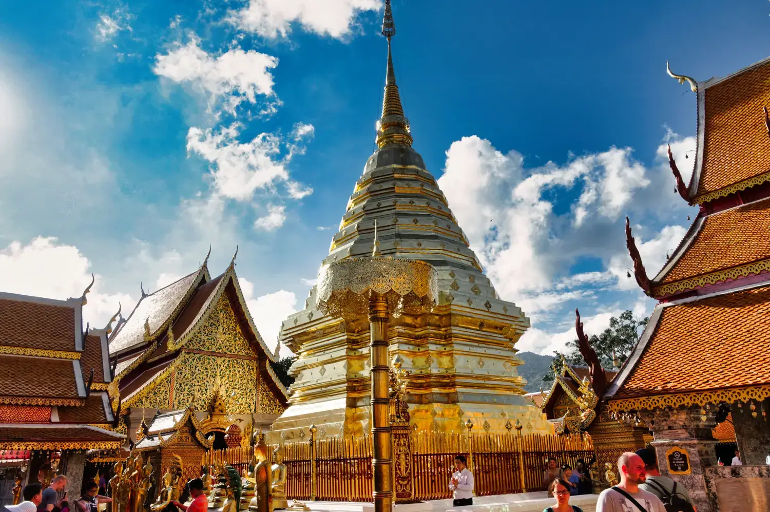 Wat Phra That Doi Suthep : Le temple emblématique, perché sur la montagne. La vue sur la ville est imprenable. On y accède par un escalier de 309 marches flanqué de serpents Nâga.