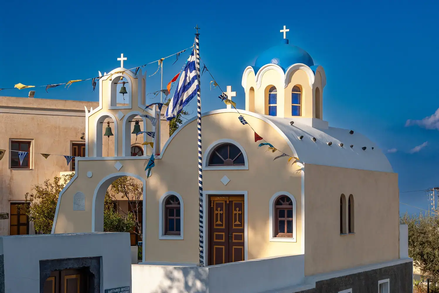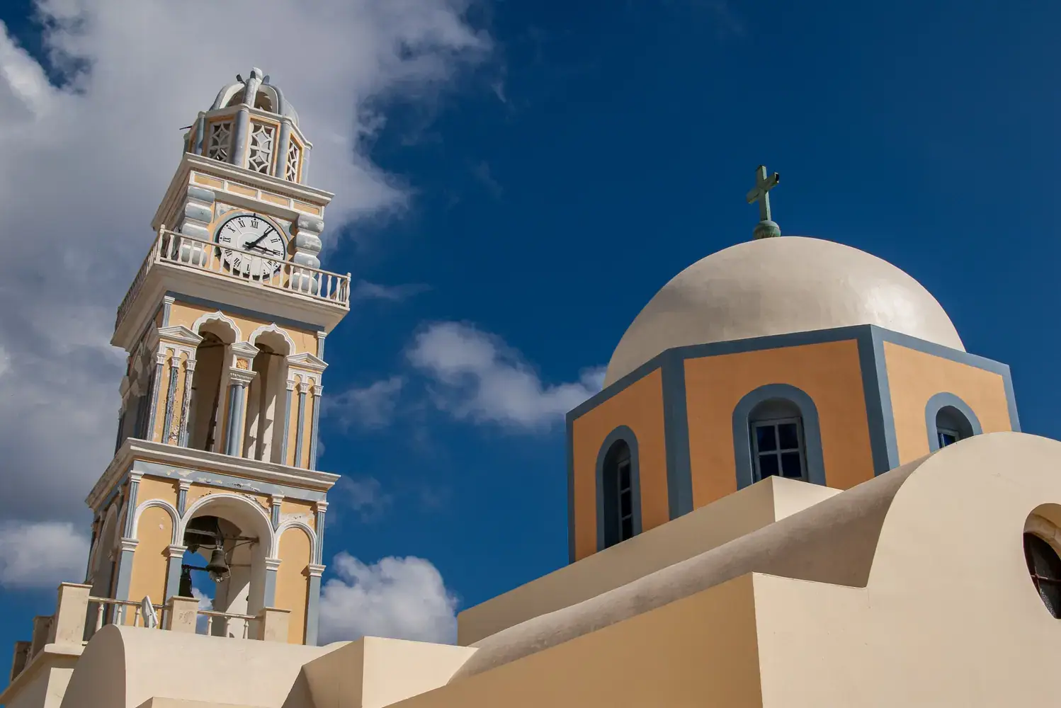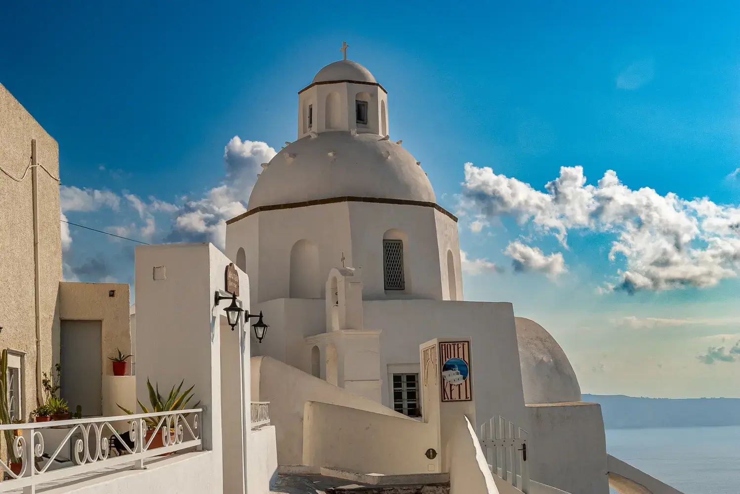 Une carte postale vivante : Ses ruelles pavées sinueuses, ses maisons blanches immaculées et ses célèbres églises aux dômes bleus, comme les incontournables Trois Cloches de Fira, créent un décor de rêve pour les photographes .