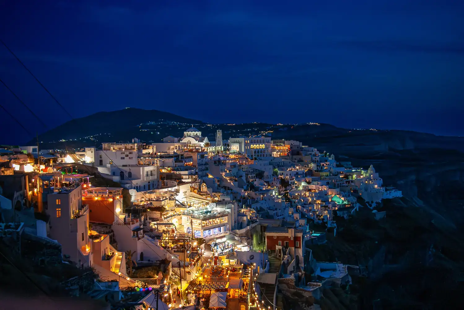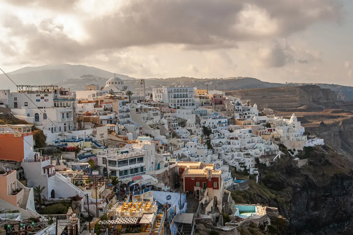 Un panorama exceptionnel : Construite à 260 mètres au-dessus de la caldeira (l’ancien cratère du volcan), Fira offre des points de vue spectaculaires, en particulier au coucher du soleil. Une promenade piétonne longe la falaise, offrant un balcon continu sur ce paysage lunaire et marin .