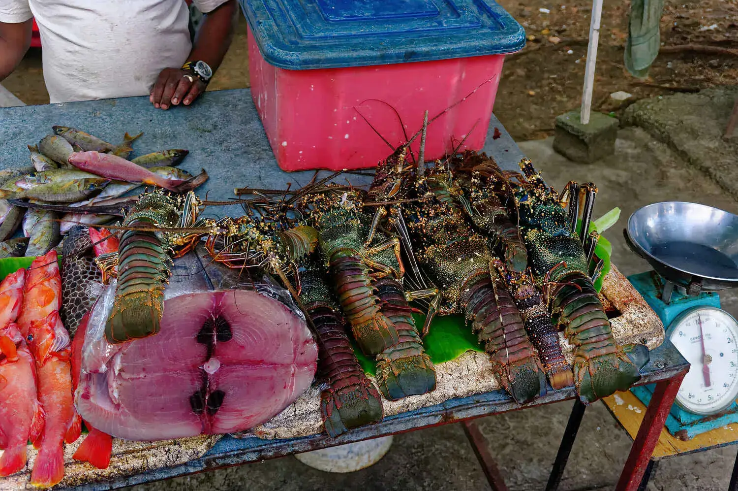 Carri : Le plat national, un curry (poulet, poisson, crevettes, etc.) servi avec du riz et des grains (lentilles, haricots).