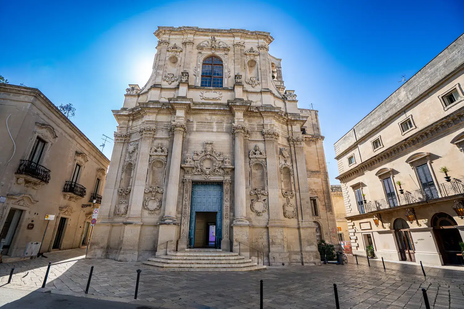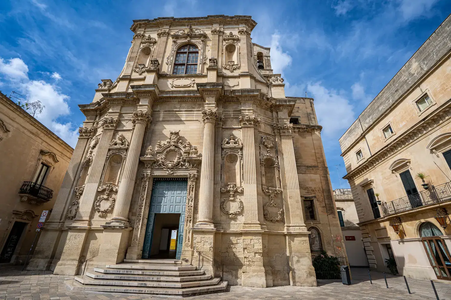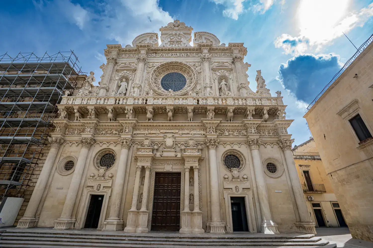La Basilique de Santa Croce : L’exemple absolu du baroque leccese. Sa façade est incroyablement détaillée, avec une rosace spectaculaire et une frise richement sculptée.