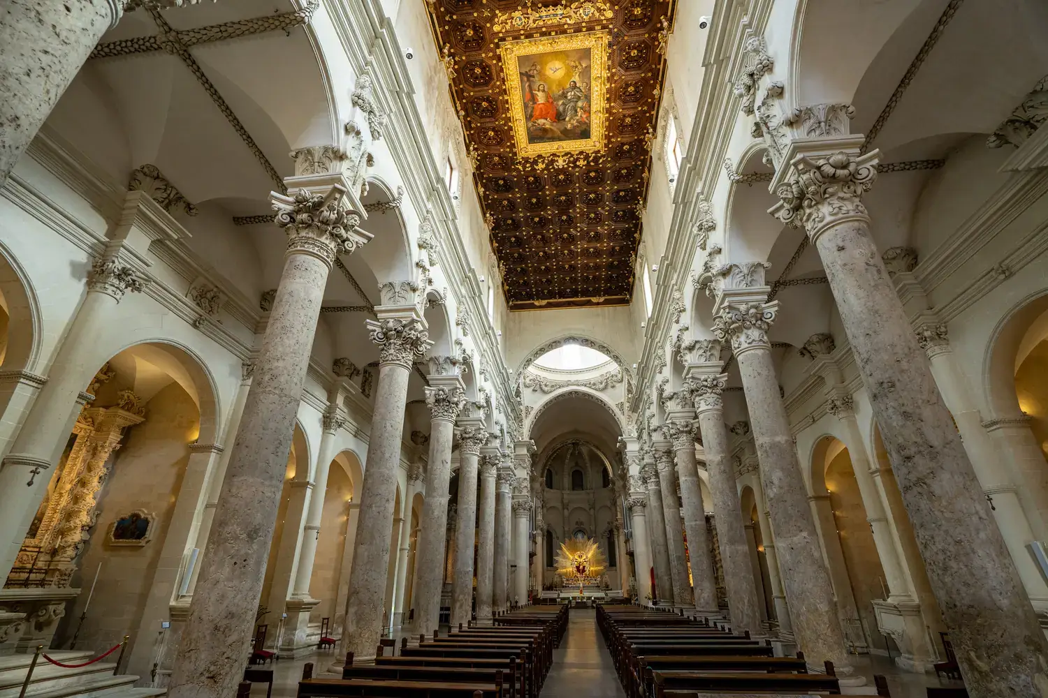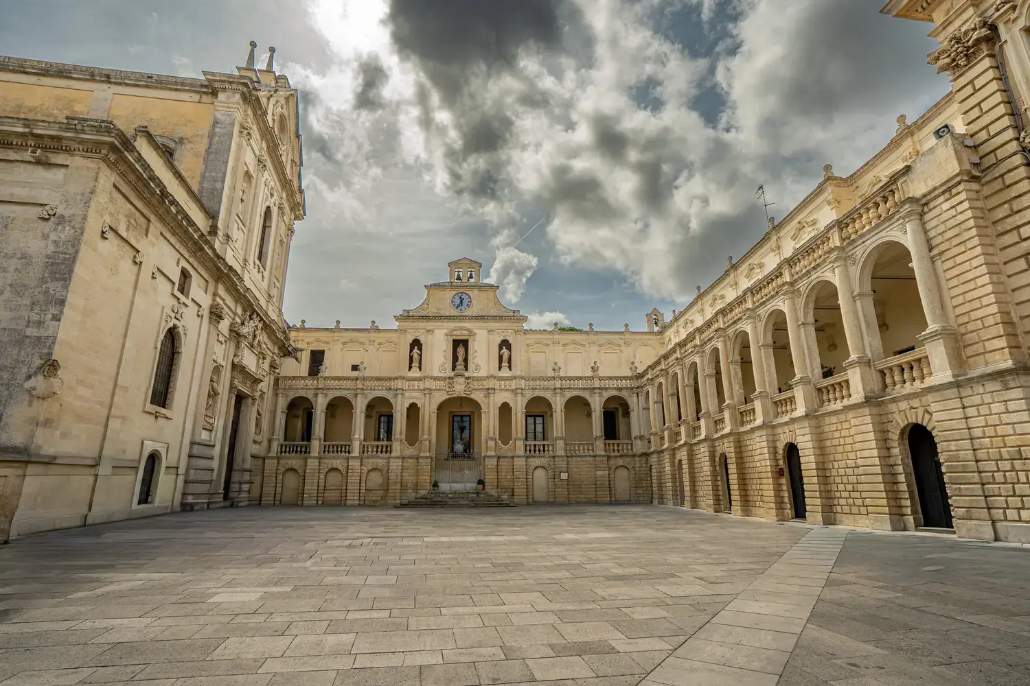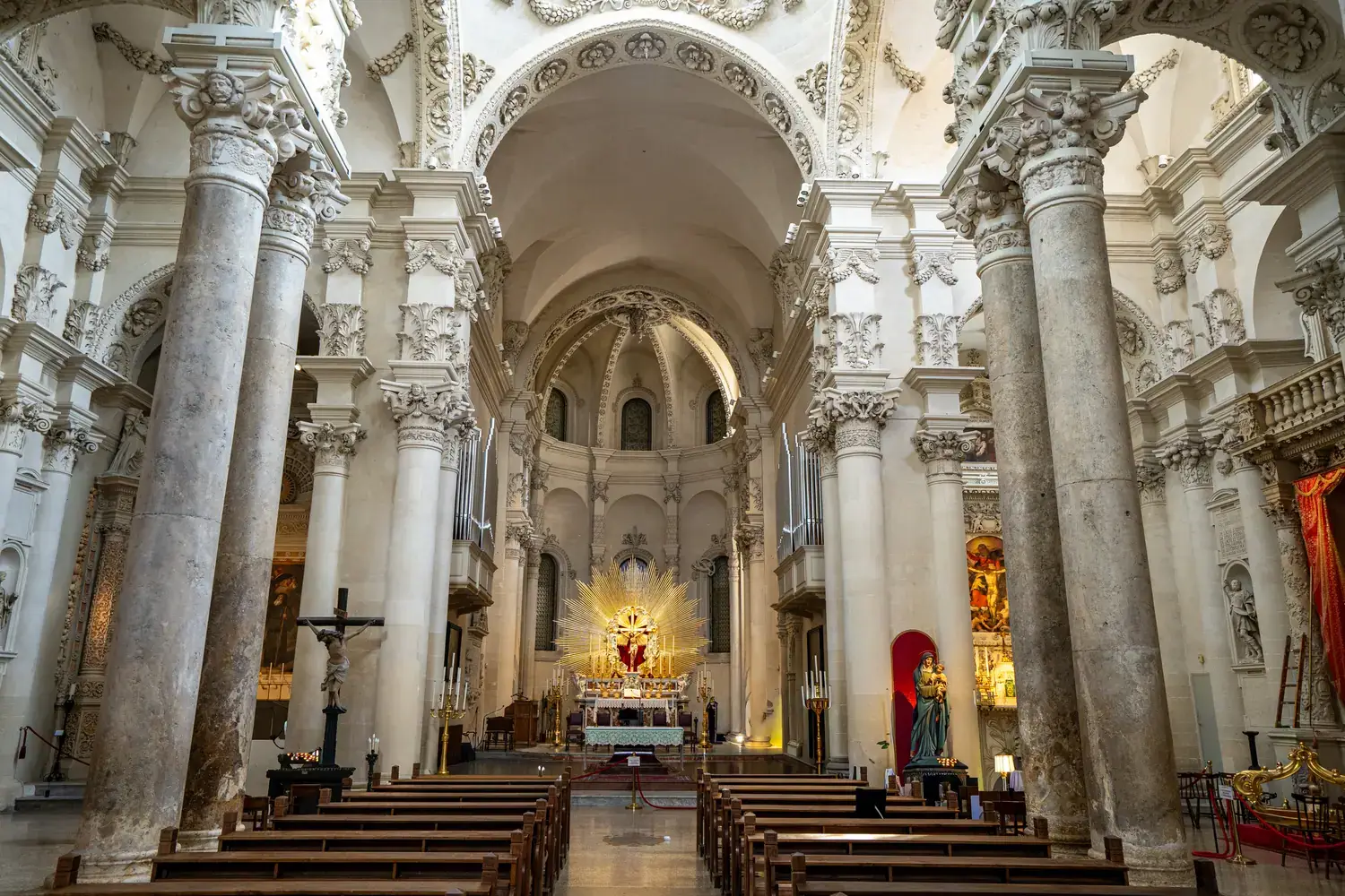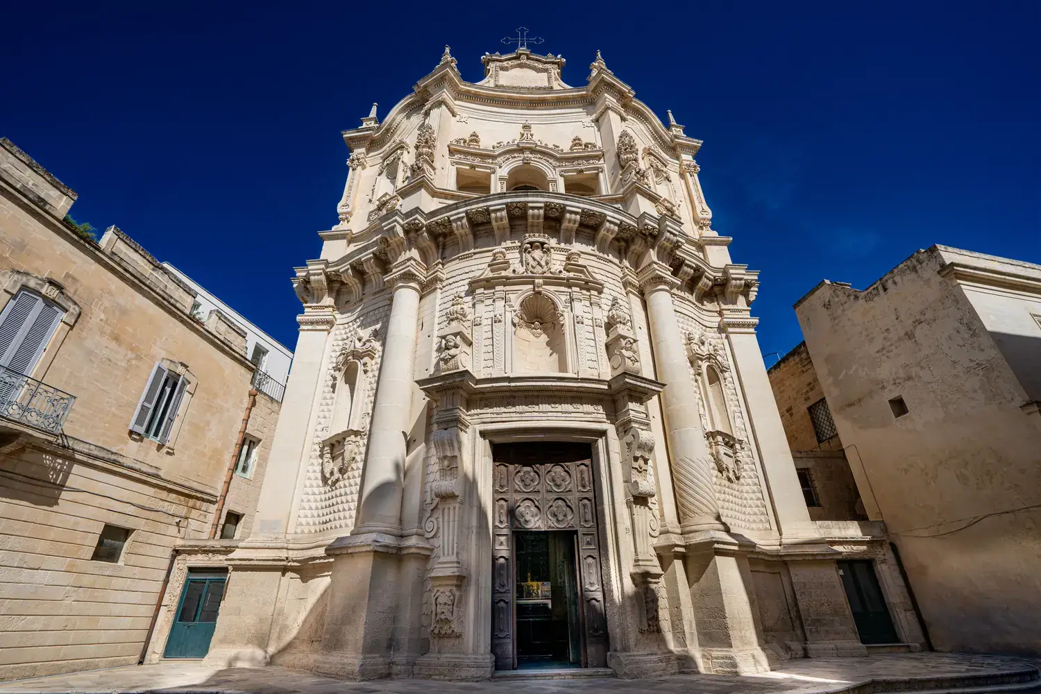 La Basilique de Santa Croce : L’exemple absolu du baroque leccese. Sa façade est incroyablement détaillée, avec une rosace spectaculaire et une frise richement sculptée.