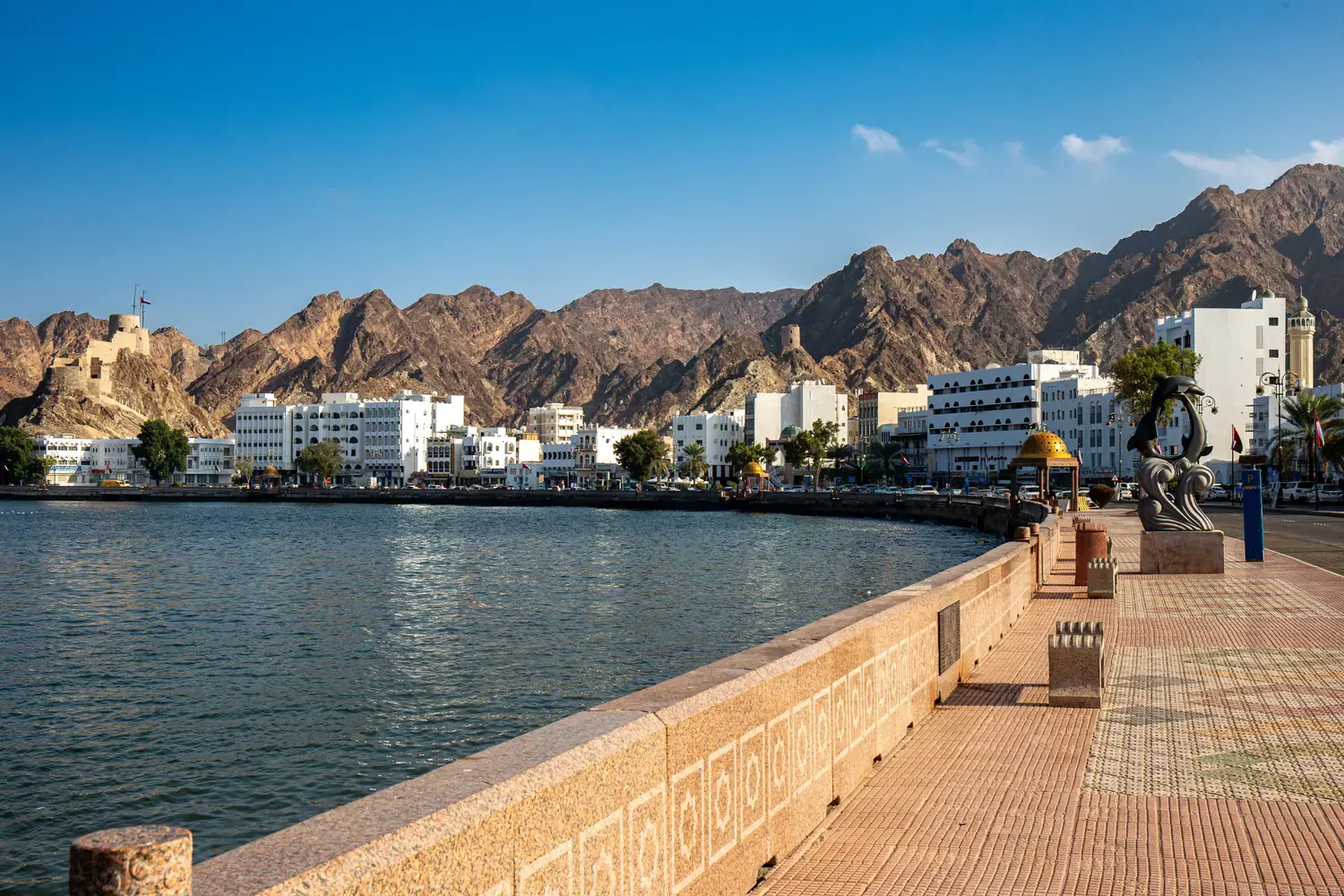 Idéales pour une promenade en fin de journée, les corniches offrent des vues magnifiques sur la mer, les montagnes et les bateaux traditionnels (dhows). C’est un lieu de vie très apprécié des habitants et des visiteurs.