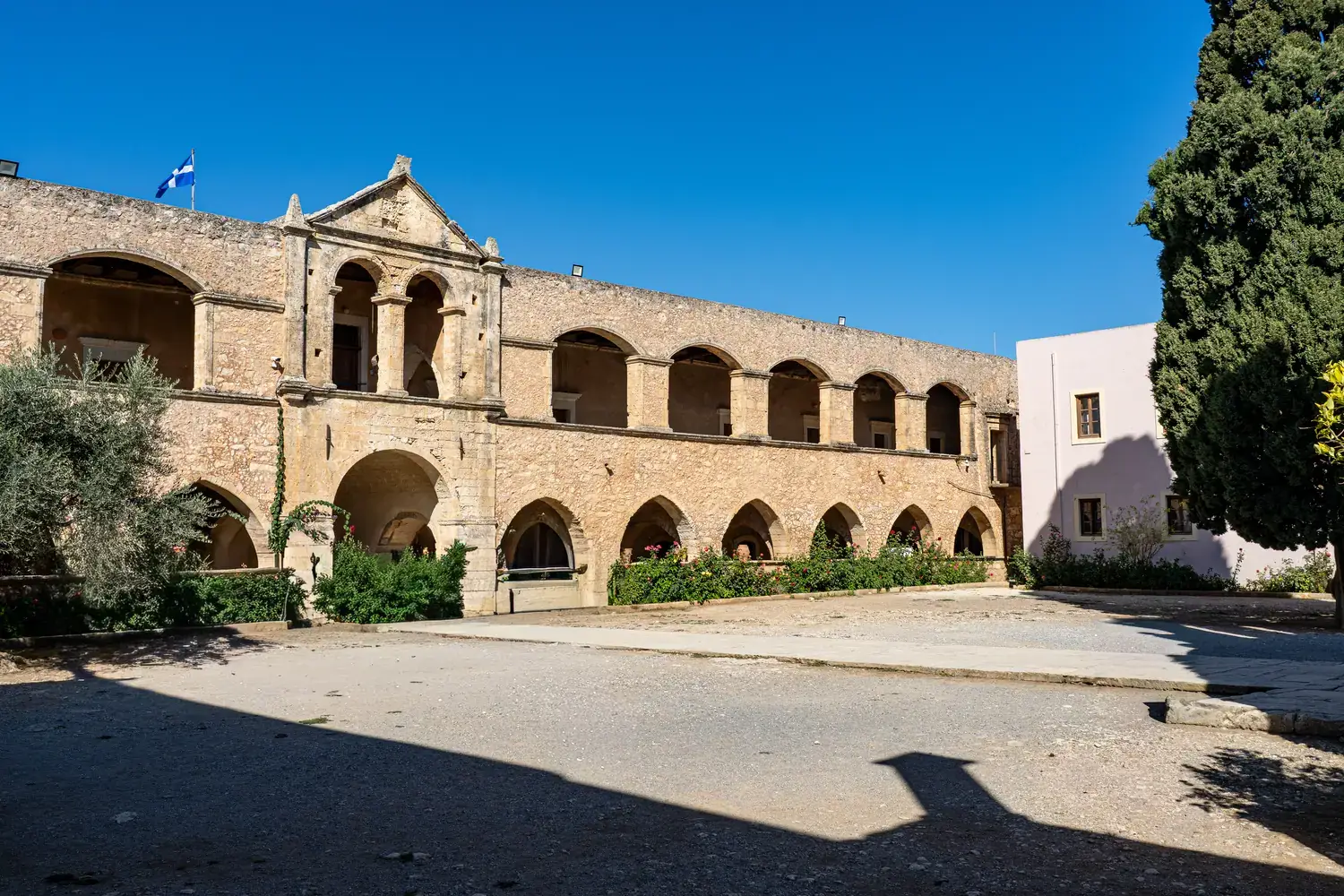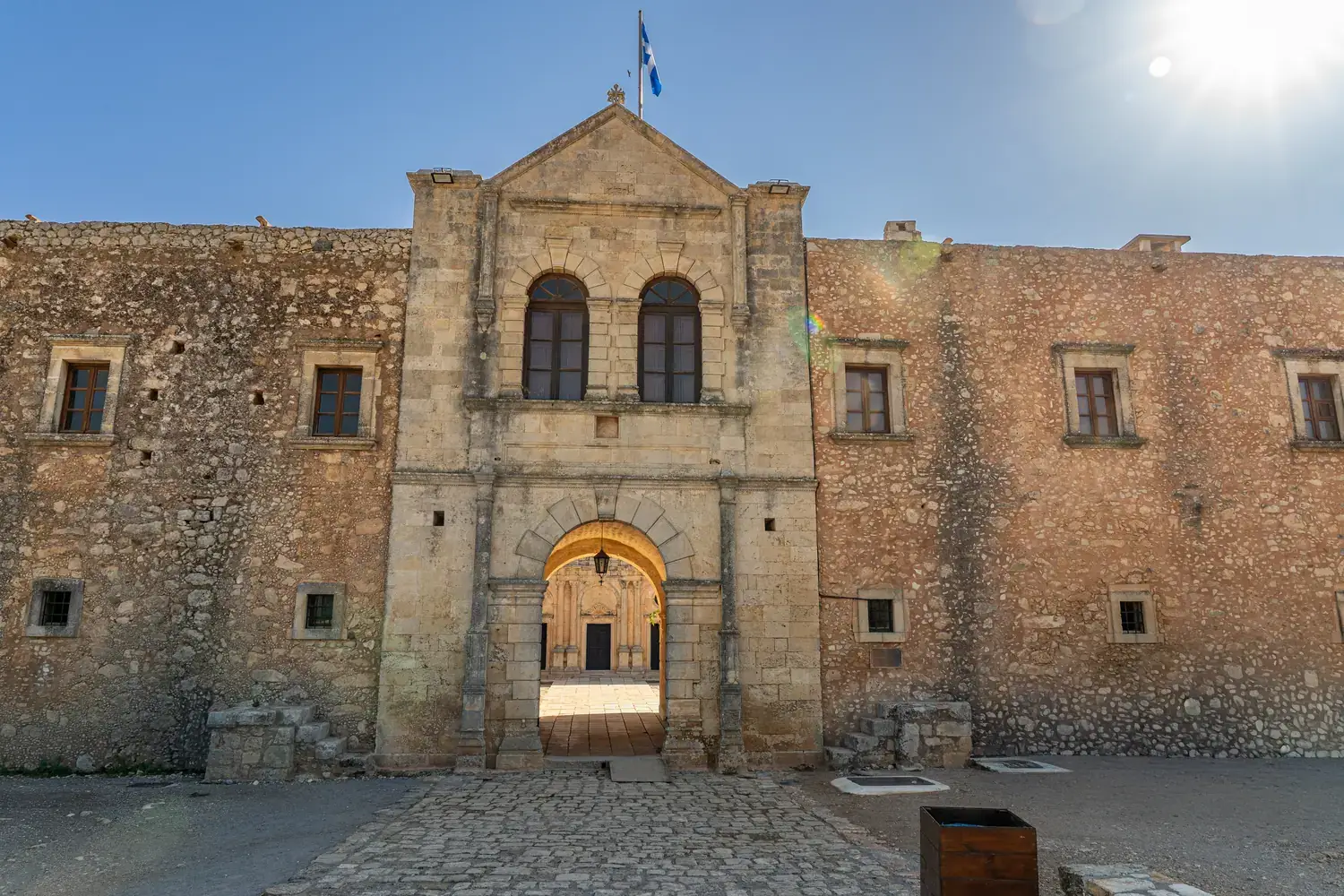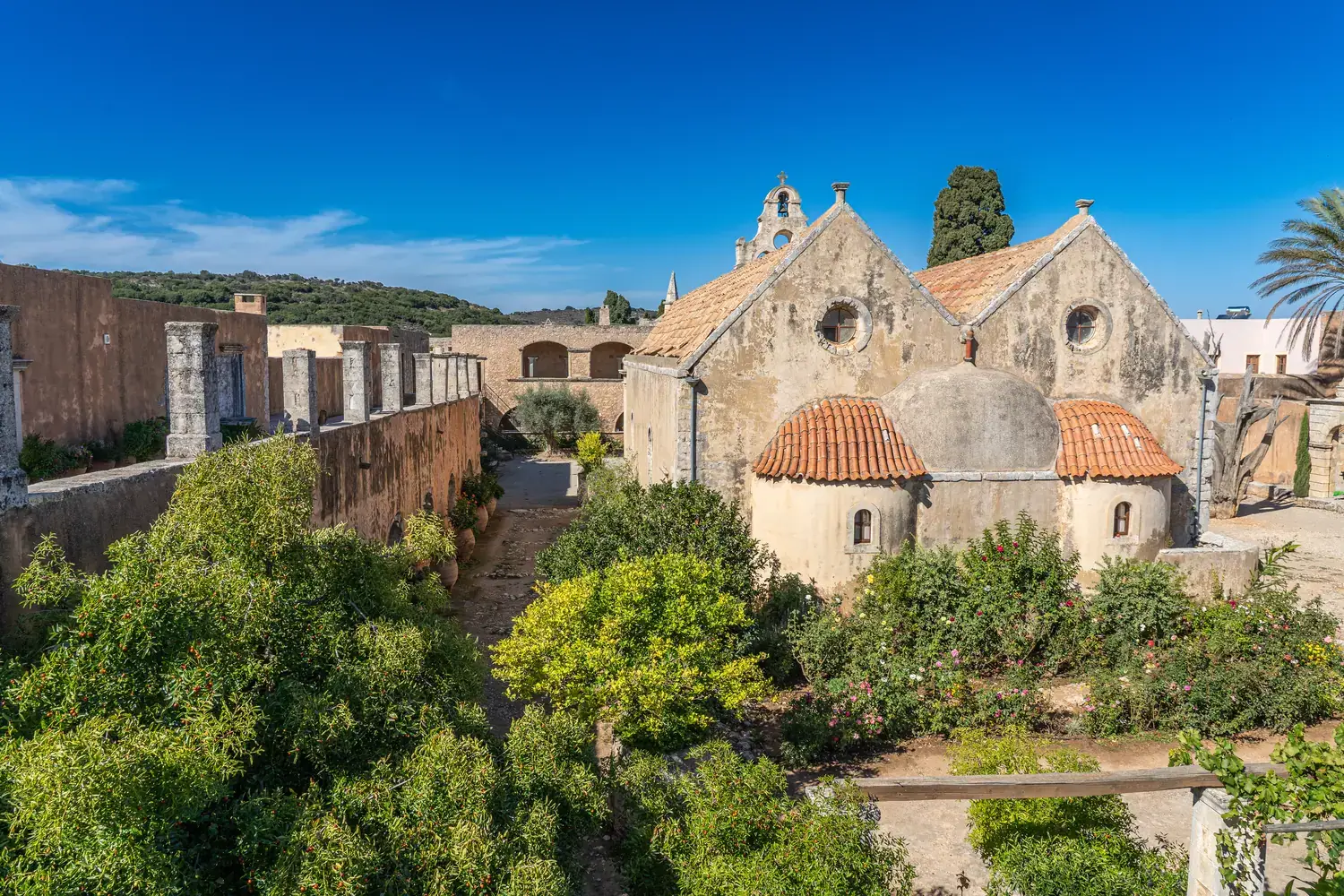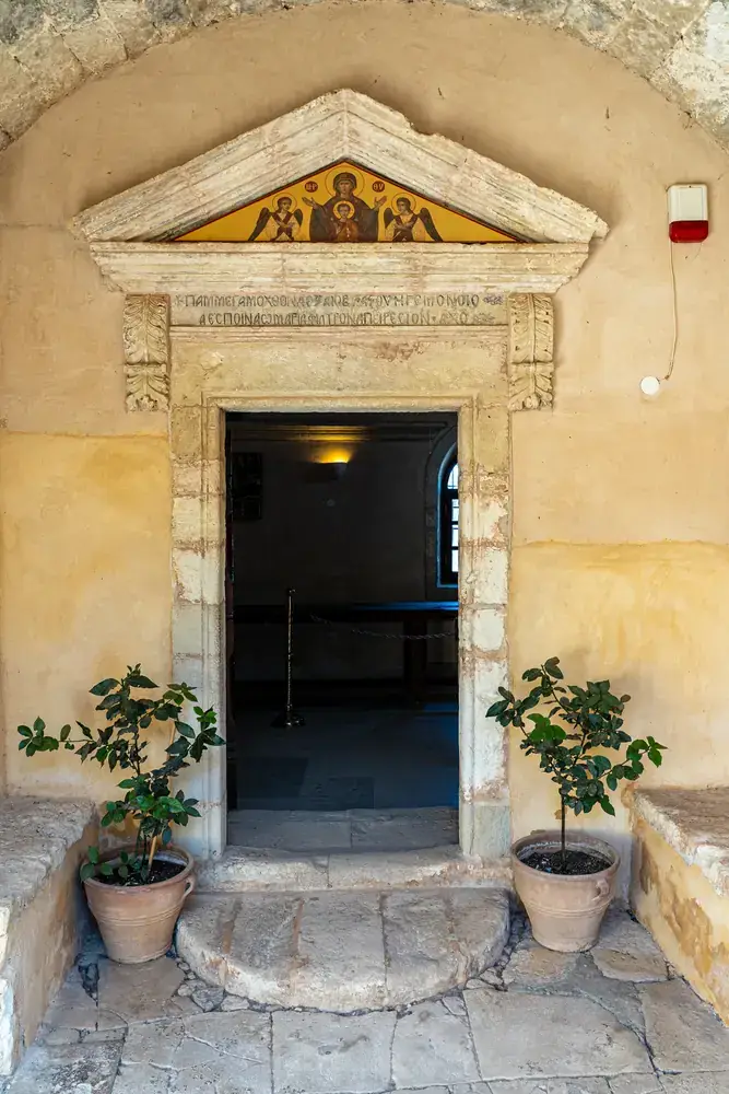 L’église (Katholikon) : Au centre de la cour intérieure se dresse l’impressionnante église à deux nefs, achevée en 1587 . Sa façade, avec ses éléments Renaissance et baroques, témoigne clairement des courants architecturaux italiens qui ont pénétré la Crète .