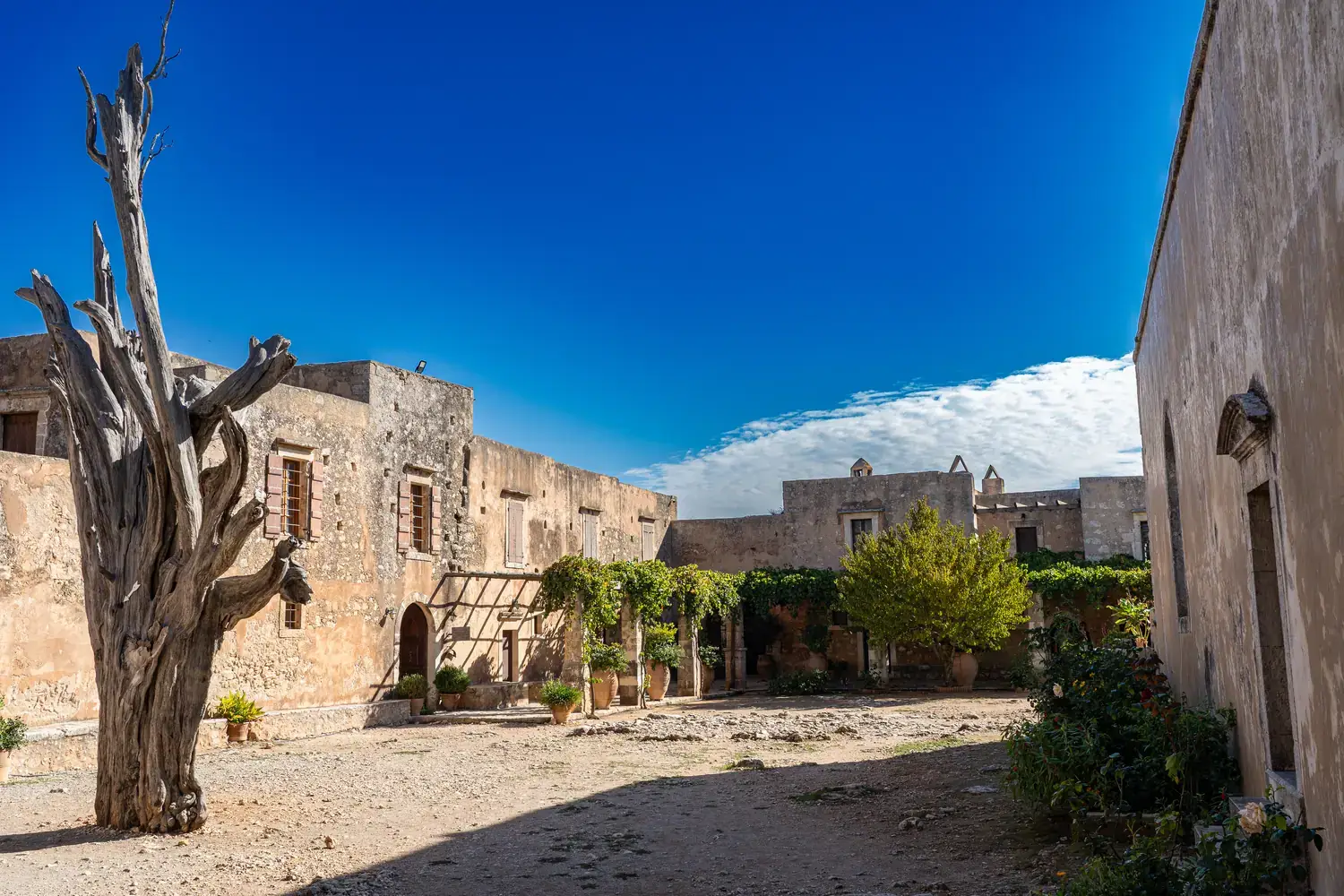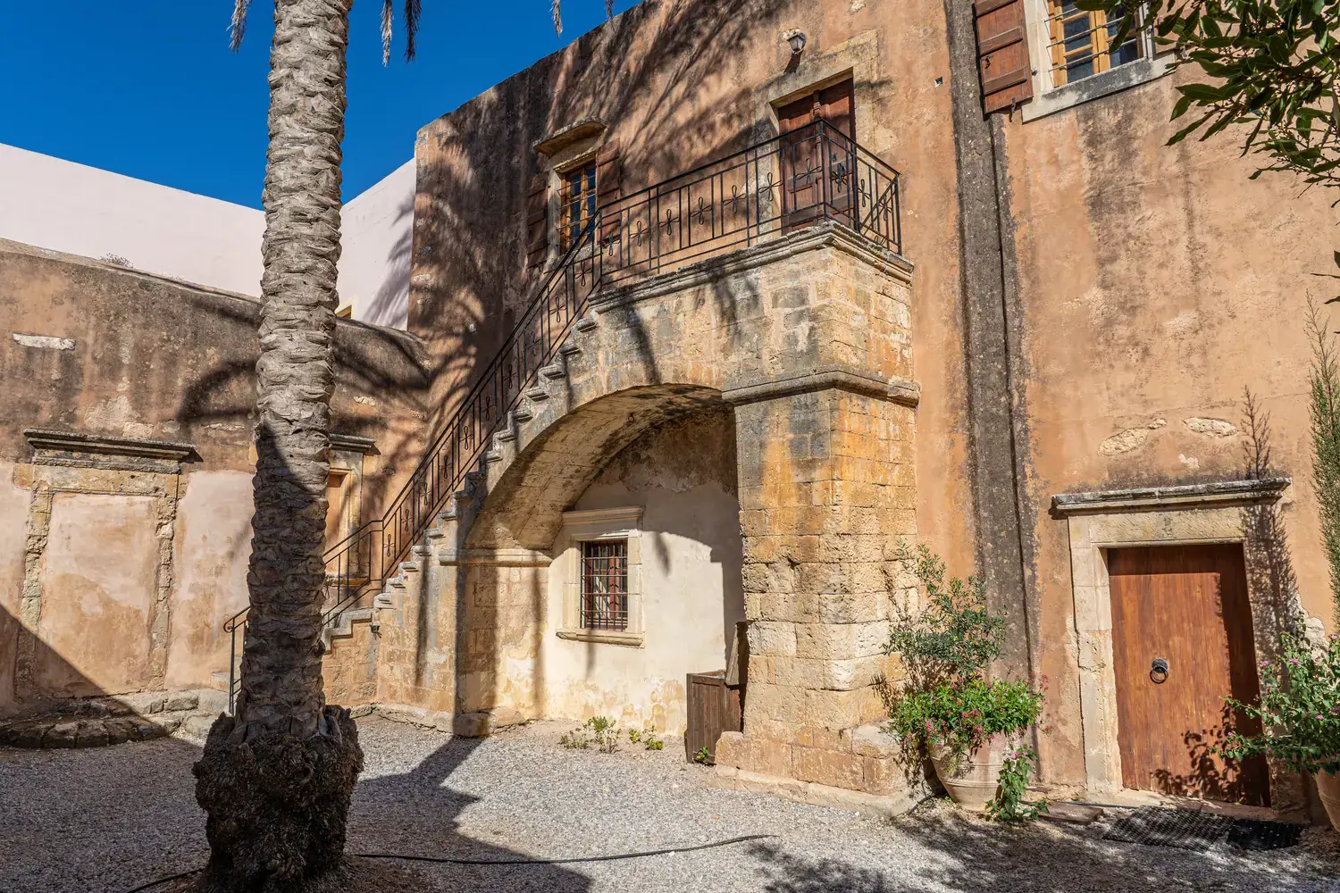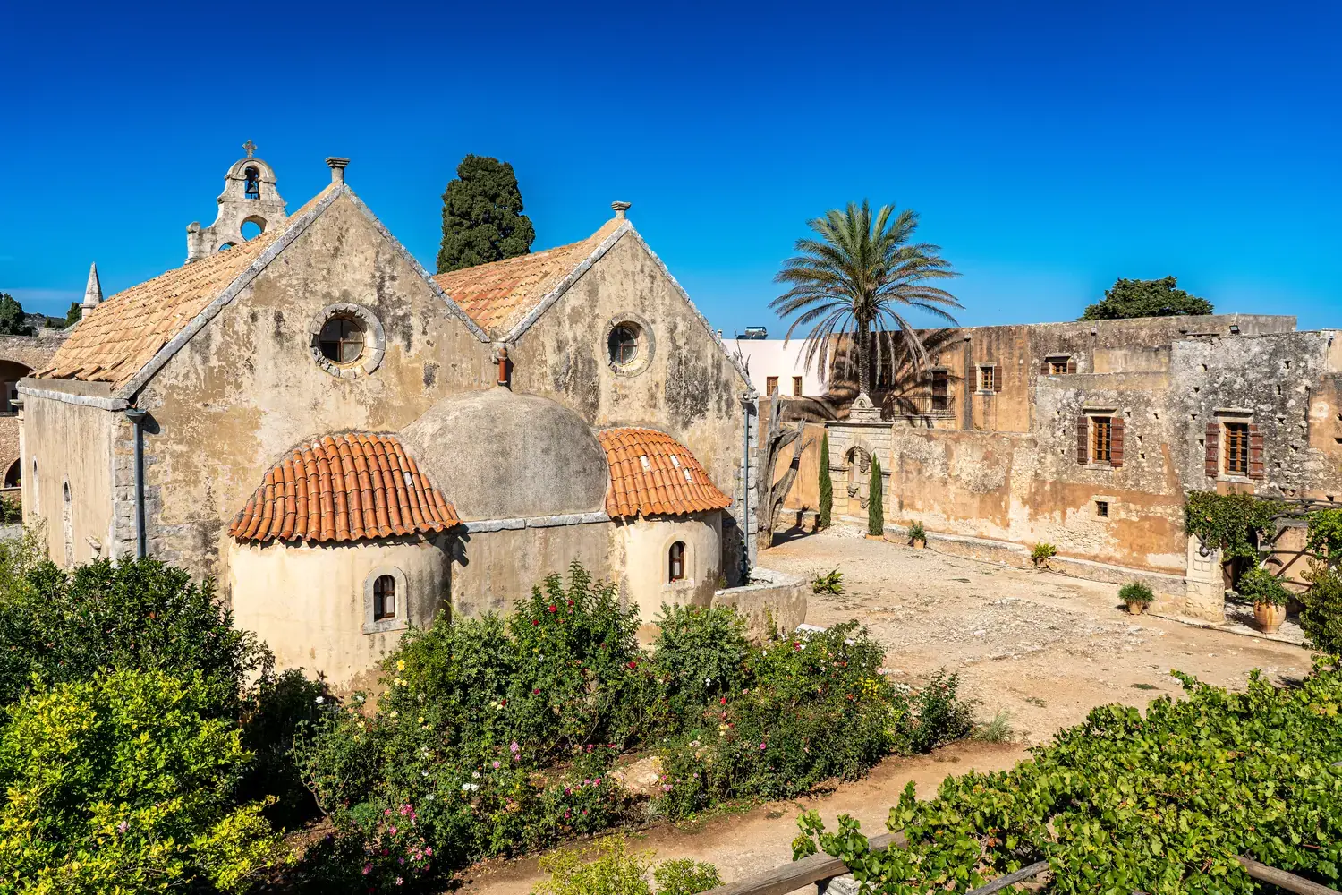 L’église (Katholikon) : Au centre de la cour intérieure se dresse l’impressionnante église à deux nefs, achevée en 1587 . Sa façade, avec ses éléments Renaissance et baroques, témoigne clairement des courants architecturaux italiens qui ont pénétré la Crète .