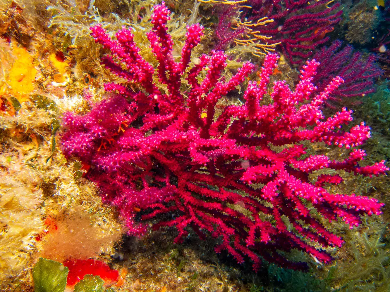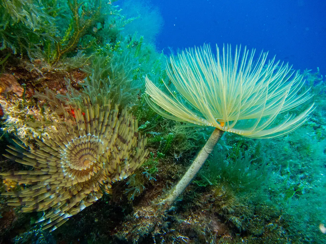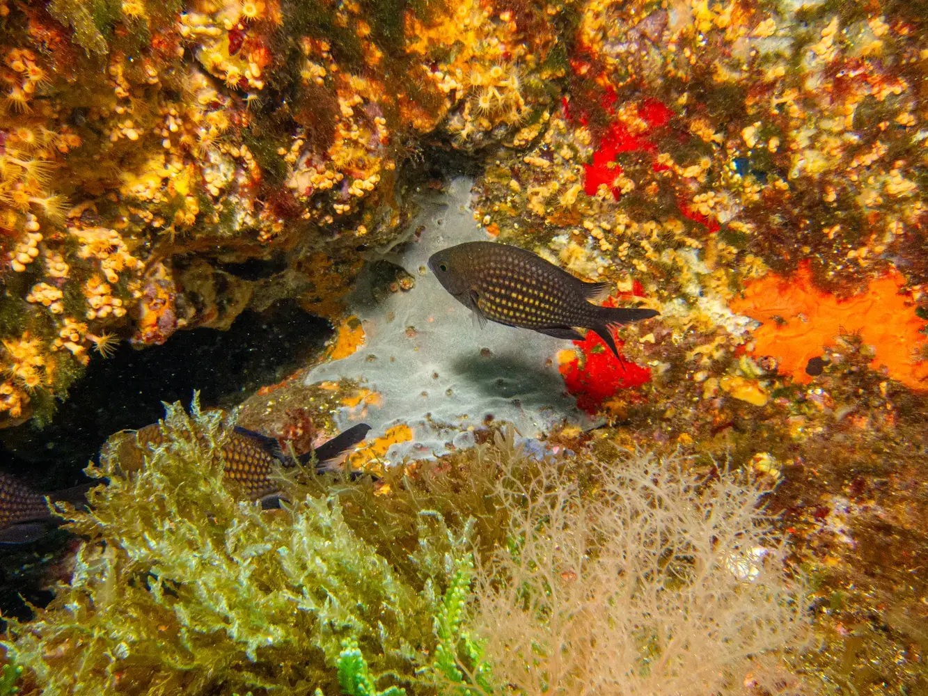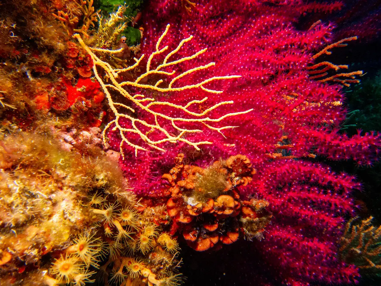 Vie fixée : Gorgones rouges et blanches, corail, éponges. Les herbiers de posidonie, véritables « forêts » sous-marines, sont omniprésents et essentiels à l’écosystème.