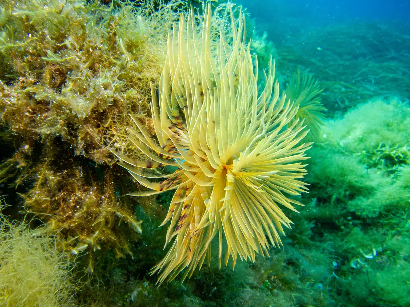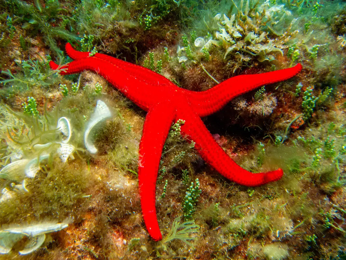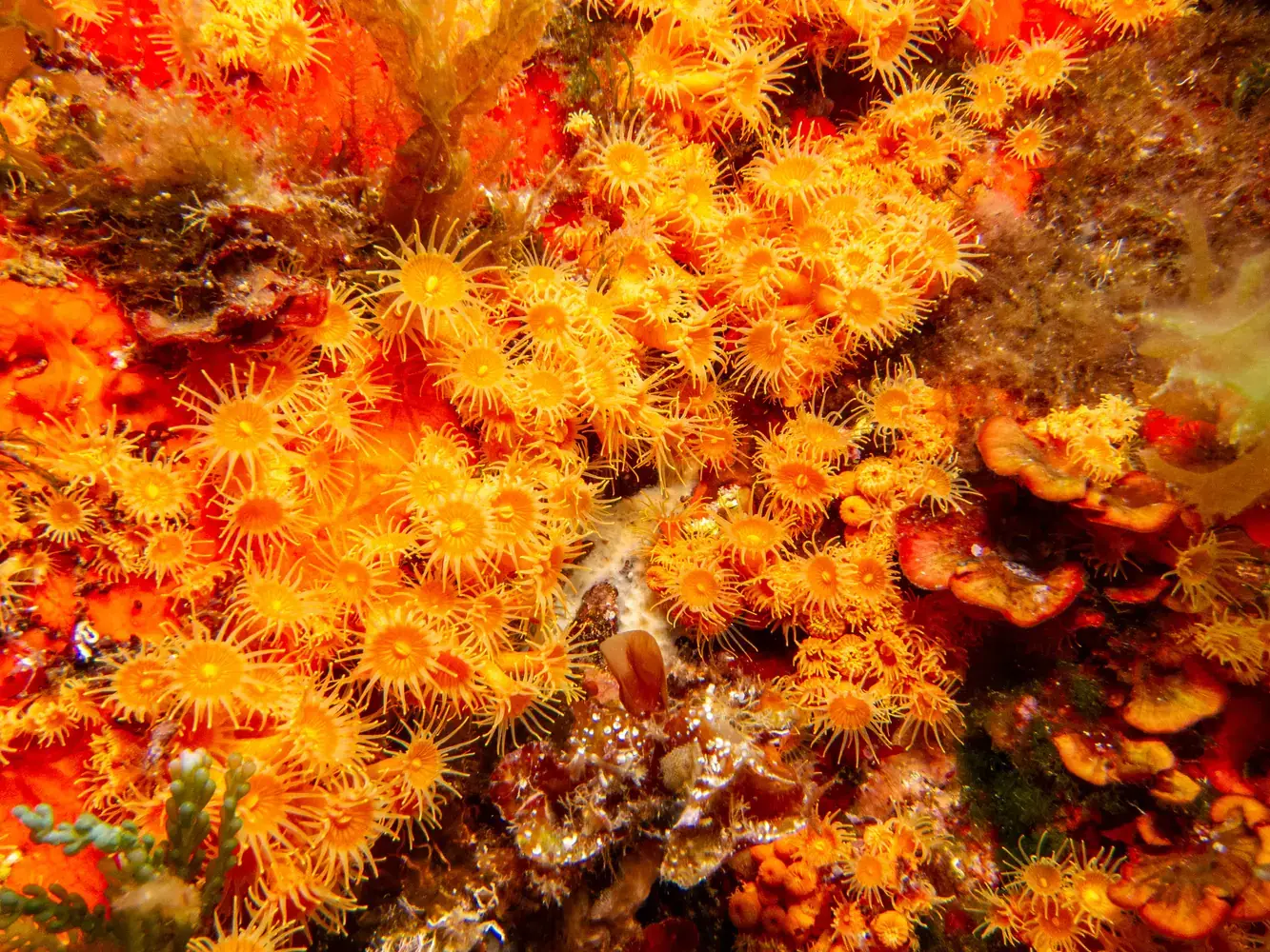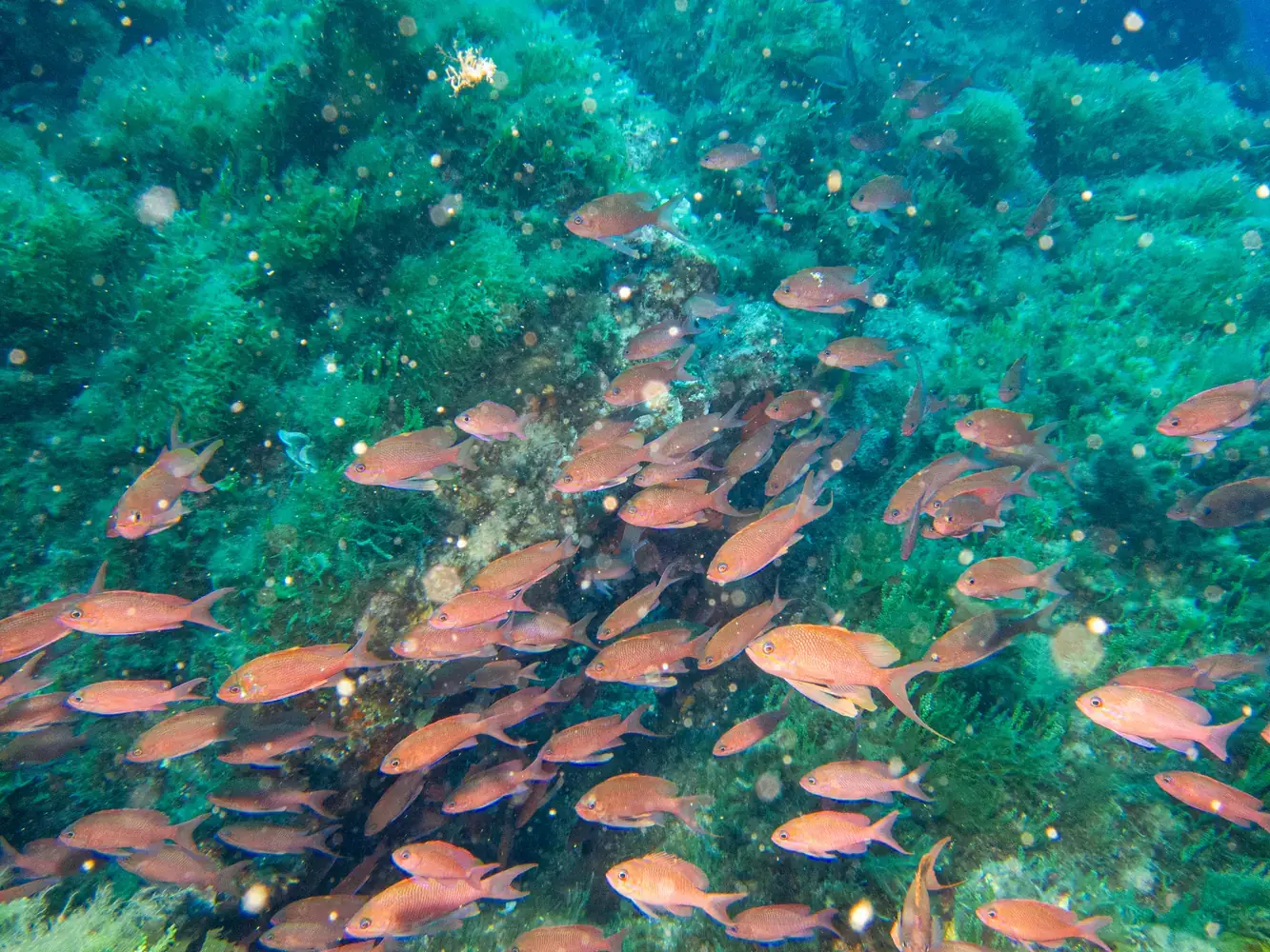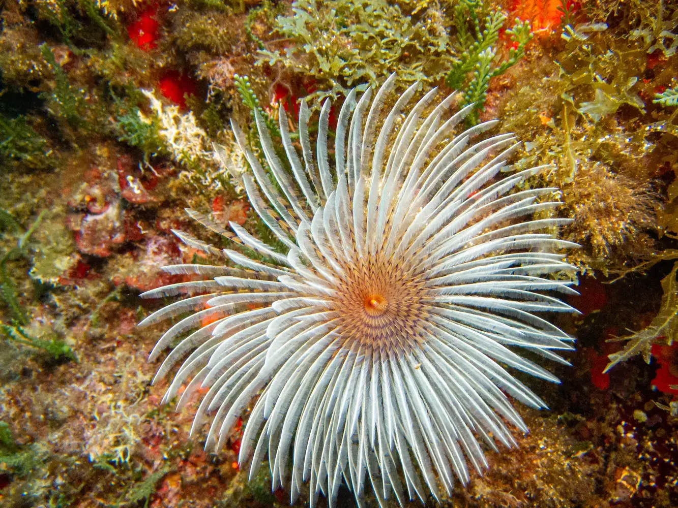 Vie fixée : Gorgones rouges et blanches, corail, éponges. Les herbiers de posidonie, véritables « forêts » sous-marines, sont omniprésents et essentiels à l’écosystème.