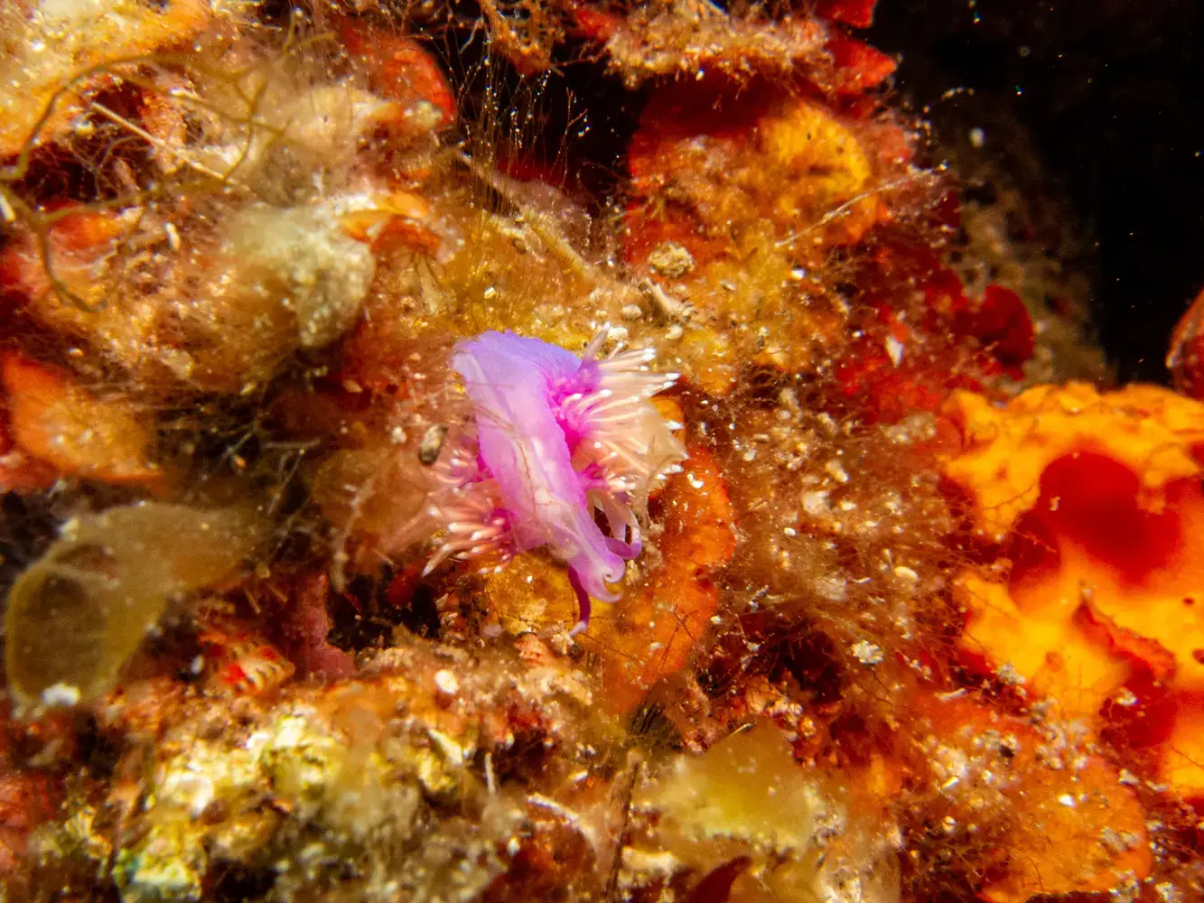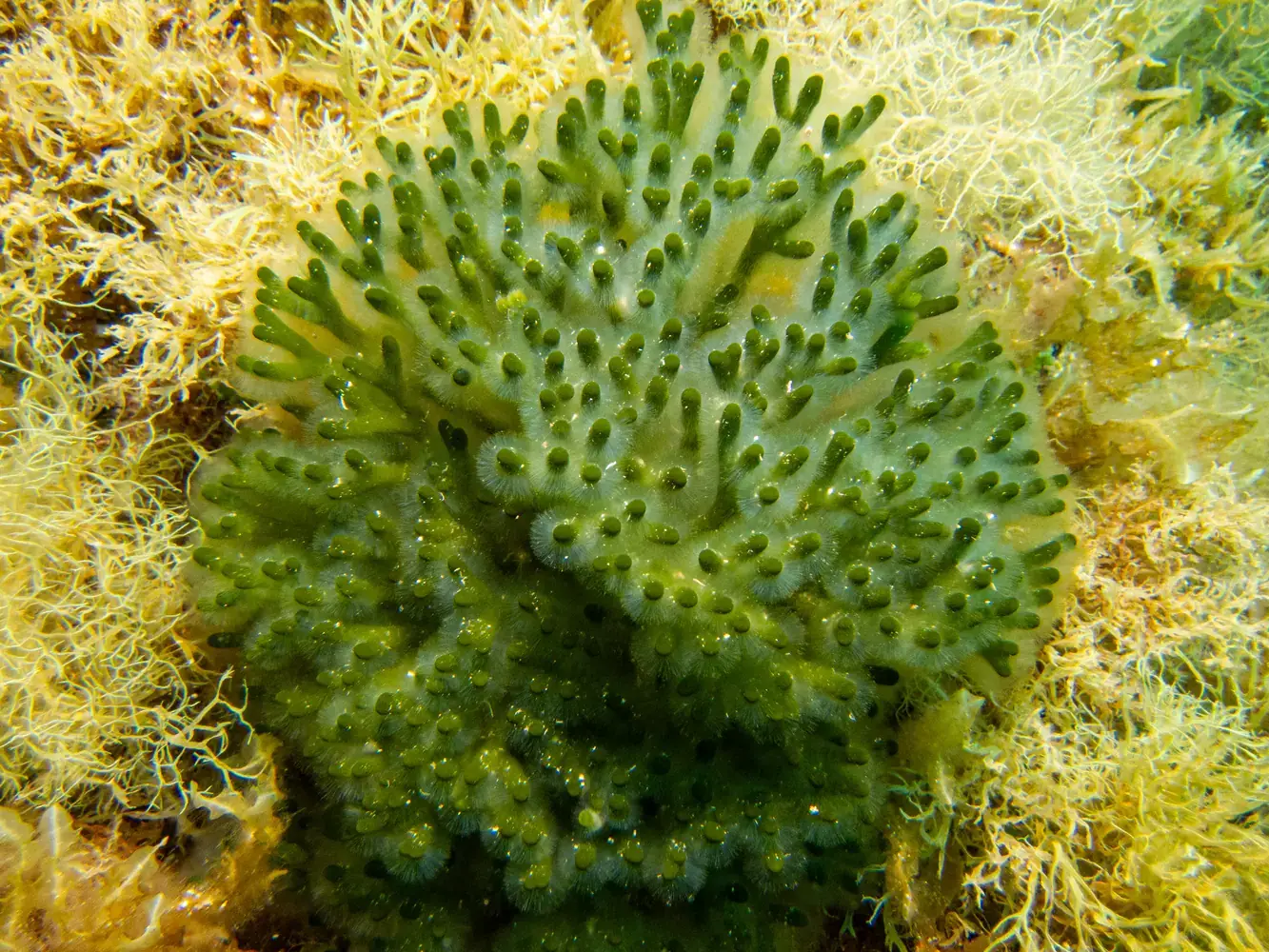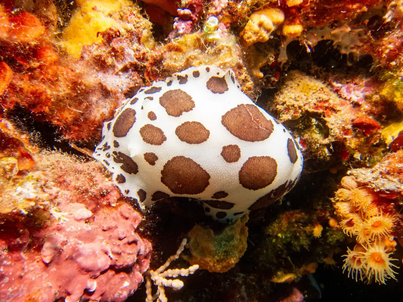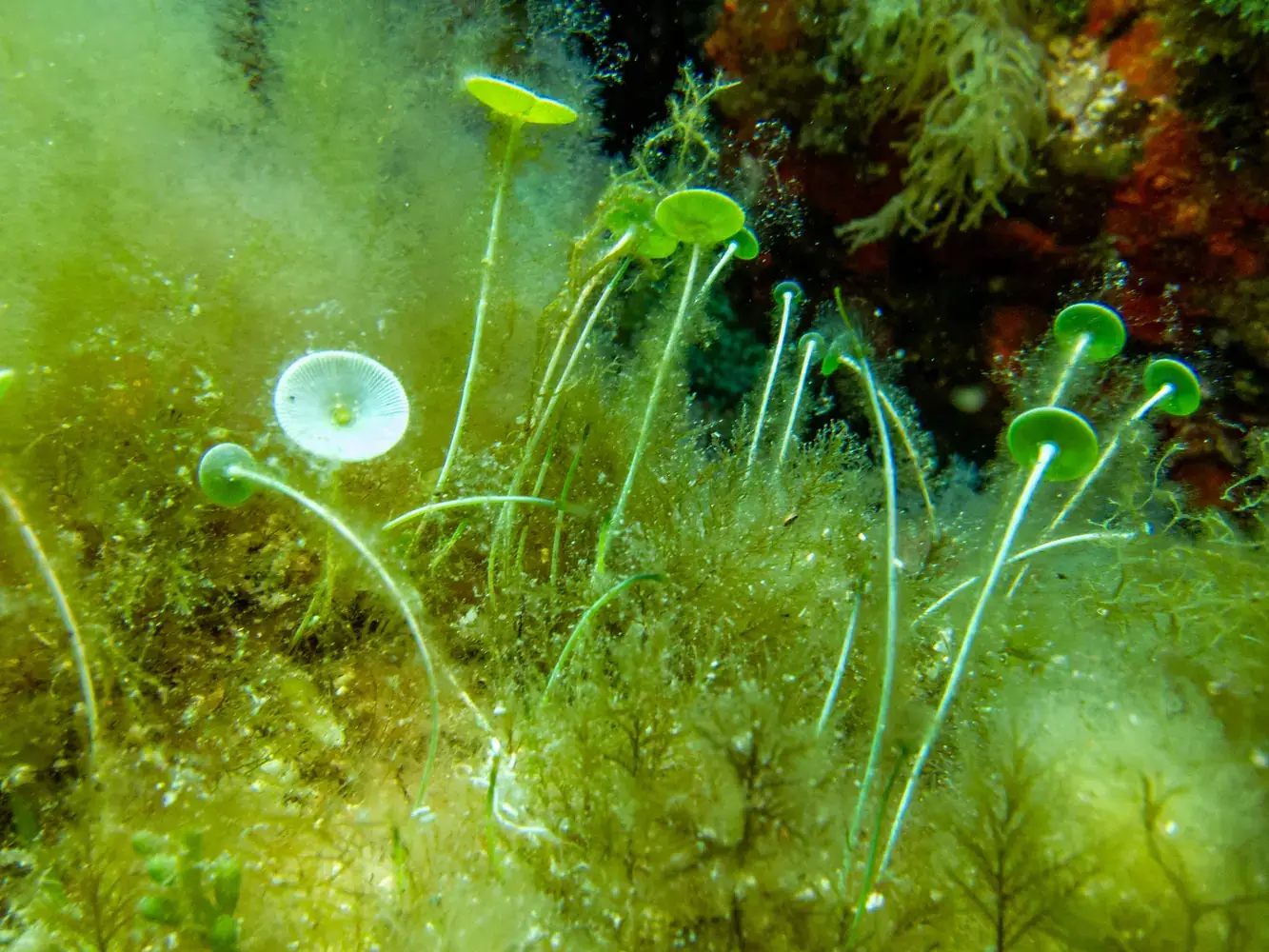 Vie fixée : Gorgones rouges et blanches, corail, éponges. Les herbiers de posidonie, véritables « forêts » sous-marines, sont omniprésents et essentiels à l’écosystème.