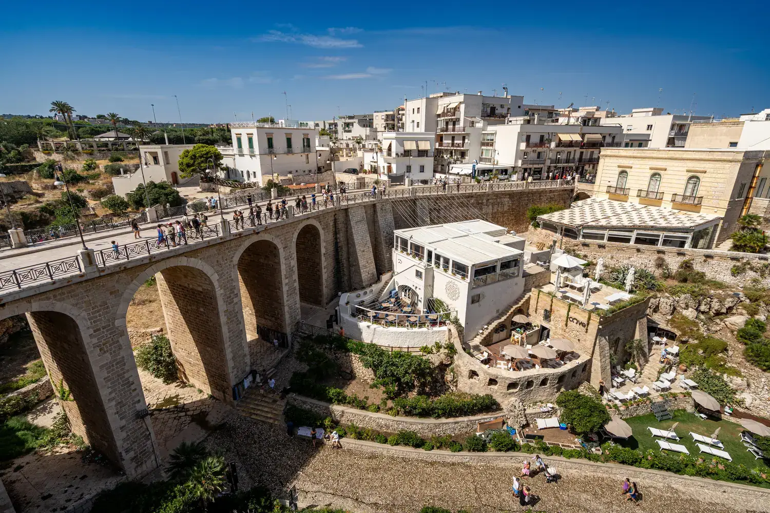 C’est l’emblème de Polignano. Il s’agit d’une petite crique unique en son genre, coincée entre deux falaises et recouverte de galets blancs. Elle est encadrée par un pont romain antique. L’eau est d’une clarté et d’une couleur incroyables.