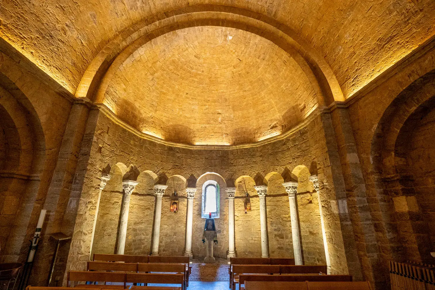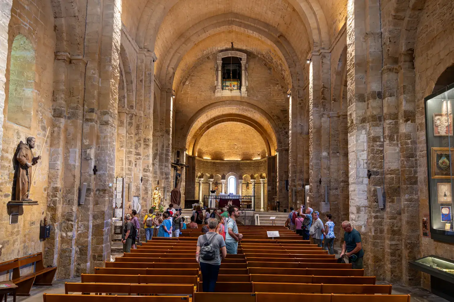 Intérieur : Le cœur de la dévotion. On y trouve la châsse contenant les reliques des deux Marie, en hauteur dans la nef. La crypte (ou chapelle basse) est un lieu de ferveur intense dédié à Sainte Sarah. Elle est vénérée par la communauté gitane (Roms, Manouches, Gitans) du monde entier. Les murs sont couverts d’ex-votos.