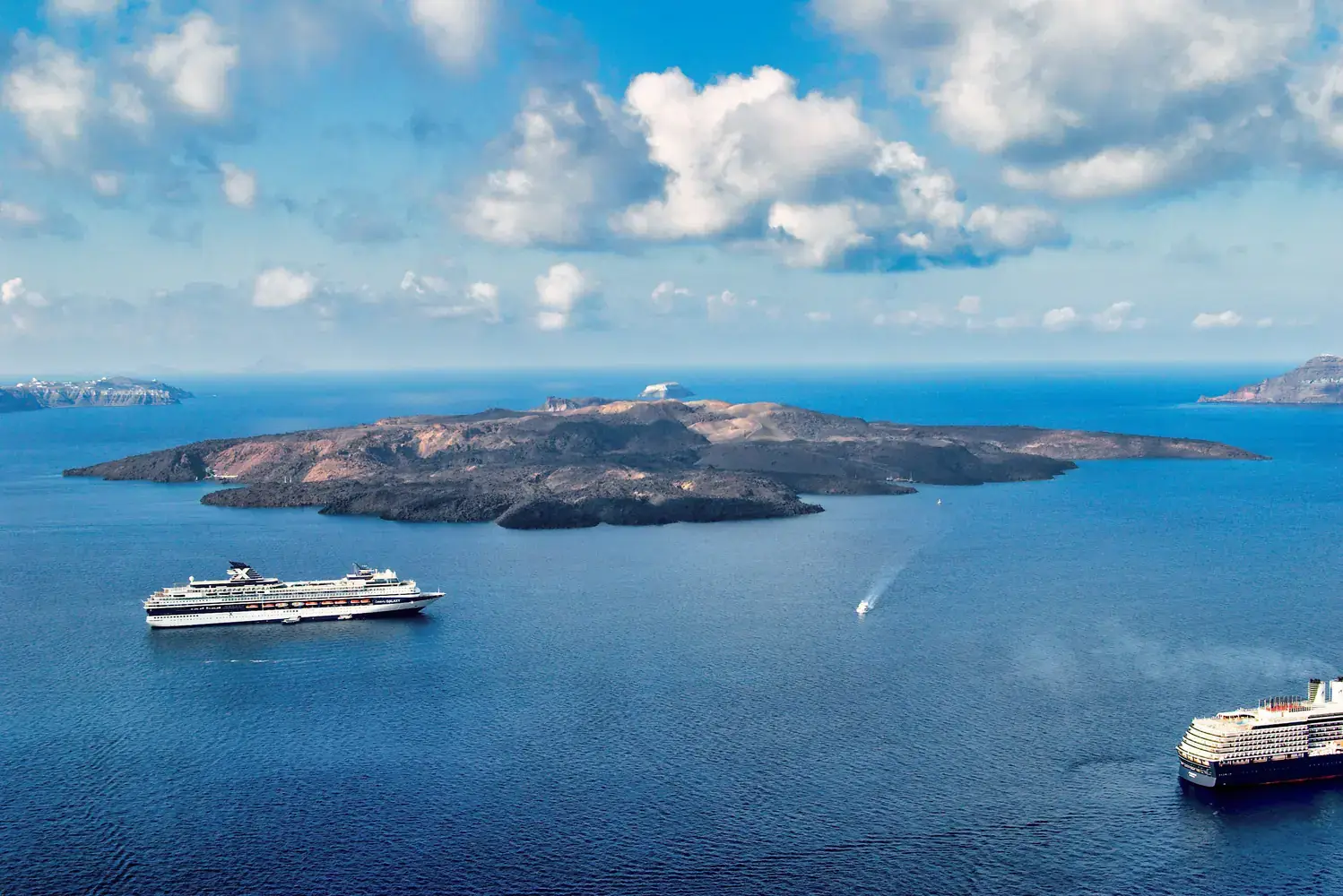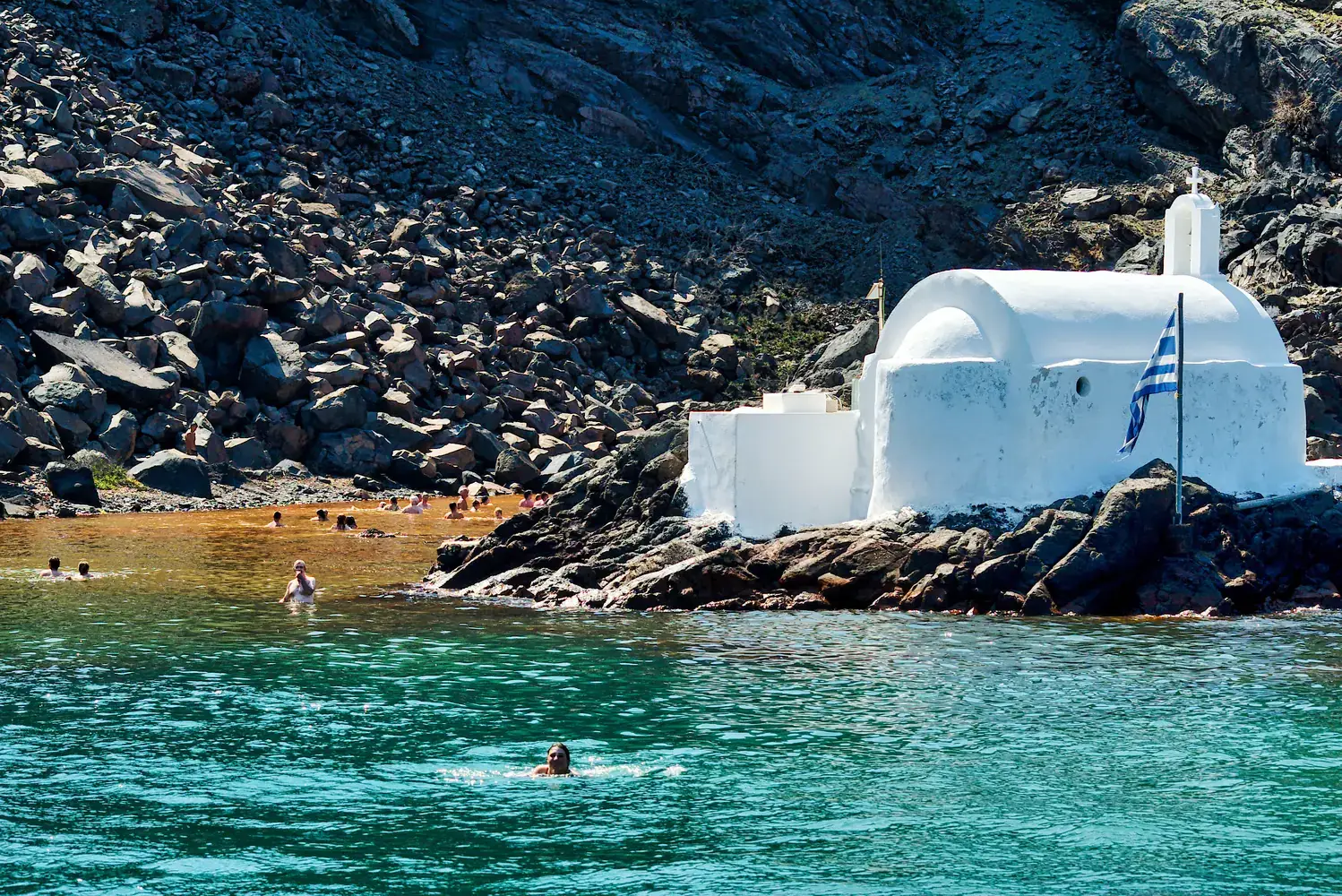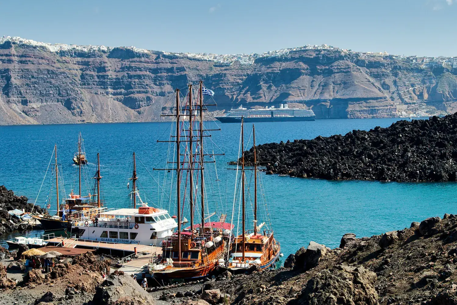 Faire une croisière dans la caldeira : Une excursion en bateau est indispensable. Elle vous mènera souvent aux sources chaudes volcaniques (près de l’îlot de Néa Kaméni), à l’île volcanique elle-même, et au village d’Thirassia.