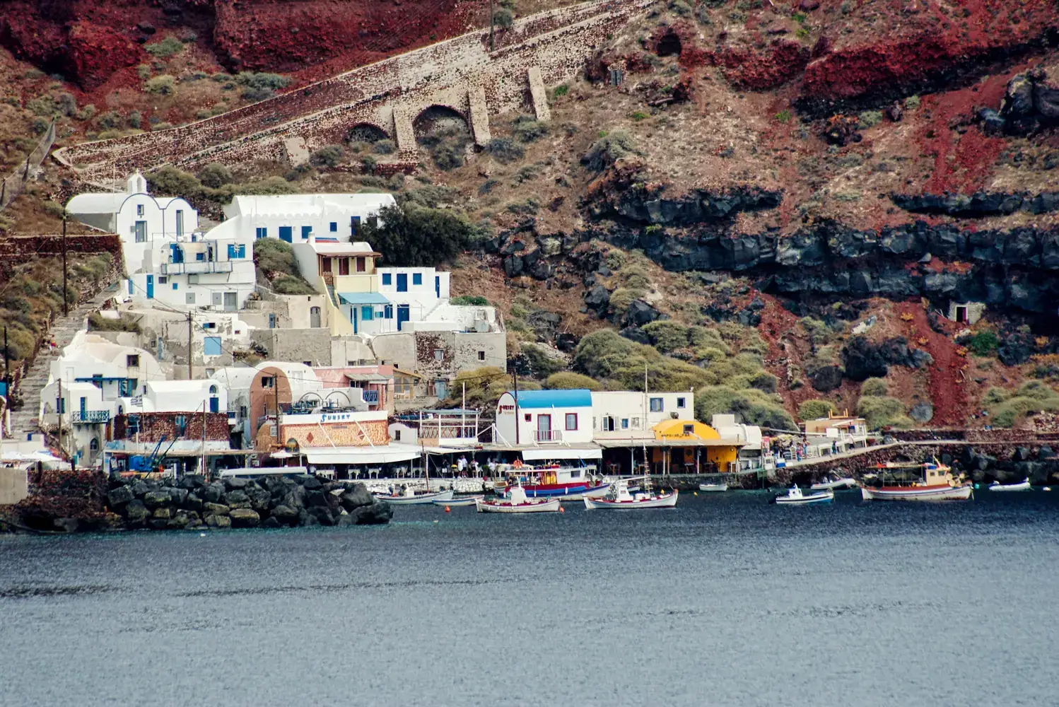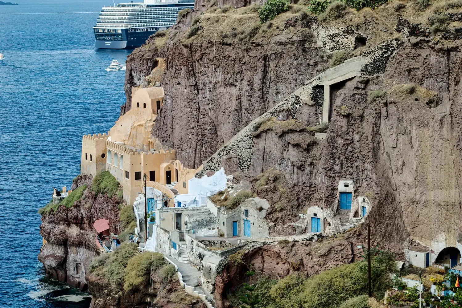 La Caldeira : C’est le cœur de Santorin. Une falaise vertigineuse de 300 mètres de haut qui plonge dans les eaux profondes de la mer Égée. Tous les villages les plus célèbres sont situés sur son rebord.