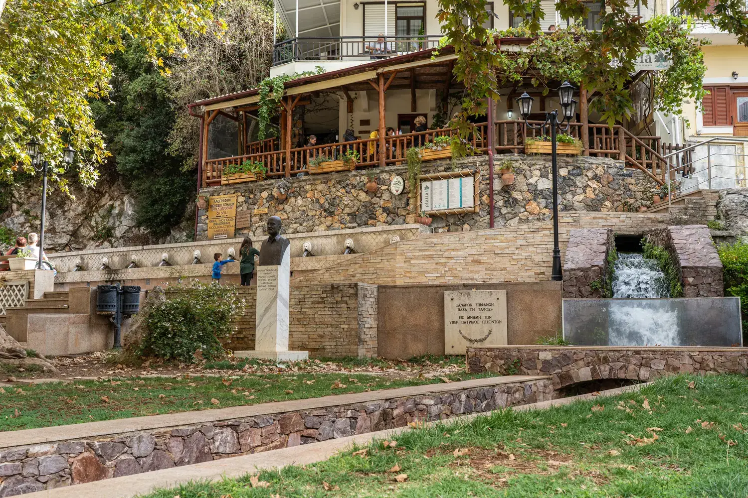 Le principal attrait et le symbole de Spíli est sans conteste sa fontaine vénitienne, appelée Kefalovrissi . Sur la place principale du village, à l’ombre de grands platanes, se dresse un long mur de pierre orné d’une rangée de 25 têtes de lion sculptées .