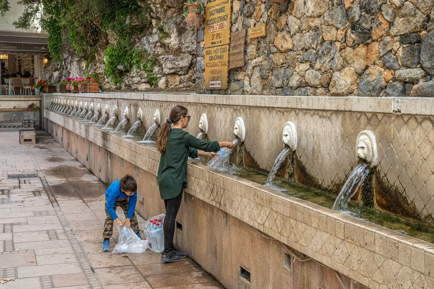 De la gueule de chaque lion, une eau de source fraîche et cristalline s’écoule en continu . Cette eau, qui provient des montagnes environnantes (notamment le Mont Psiloritis), est réputée pour sa pureté et sa température constante de 13°C . Les visiteurs et les locaux ne manquent jamais de remplir leurs bouteilles, et c’est l’endroit idéal pour faire une pause, s’asseoir à une terrasse de café et observer la vie du village .